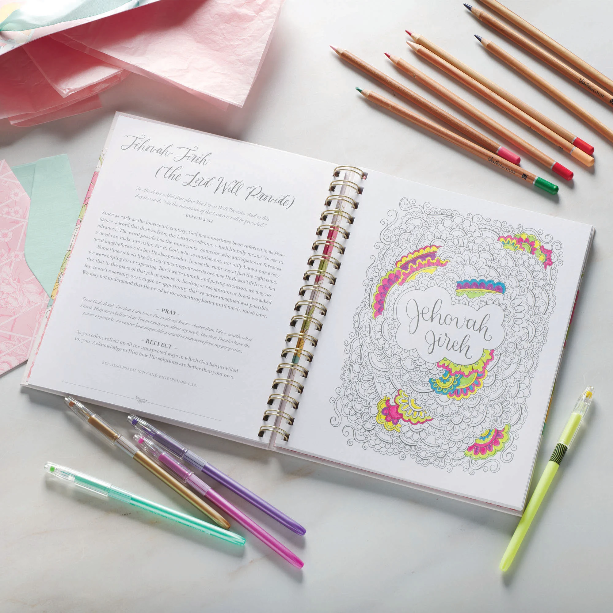 In the Coloring the Names of God Coloring Devotional, you can reflect on 52 names used to identify God in Scripture. As you ponder the meaning of these names while coloring the illustrated Bible verse, your mind will be prompted to praise God for who He is.