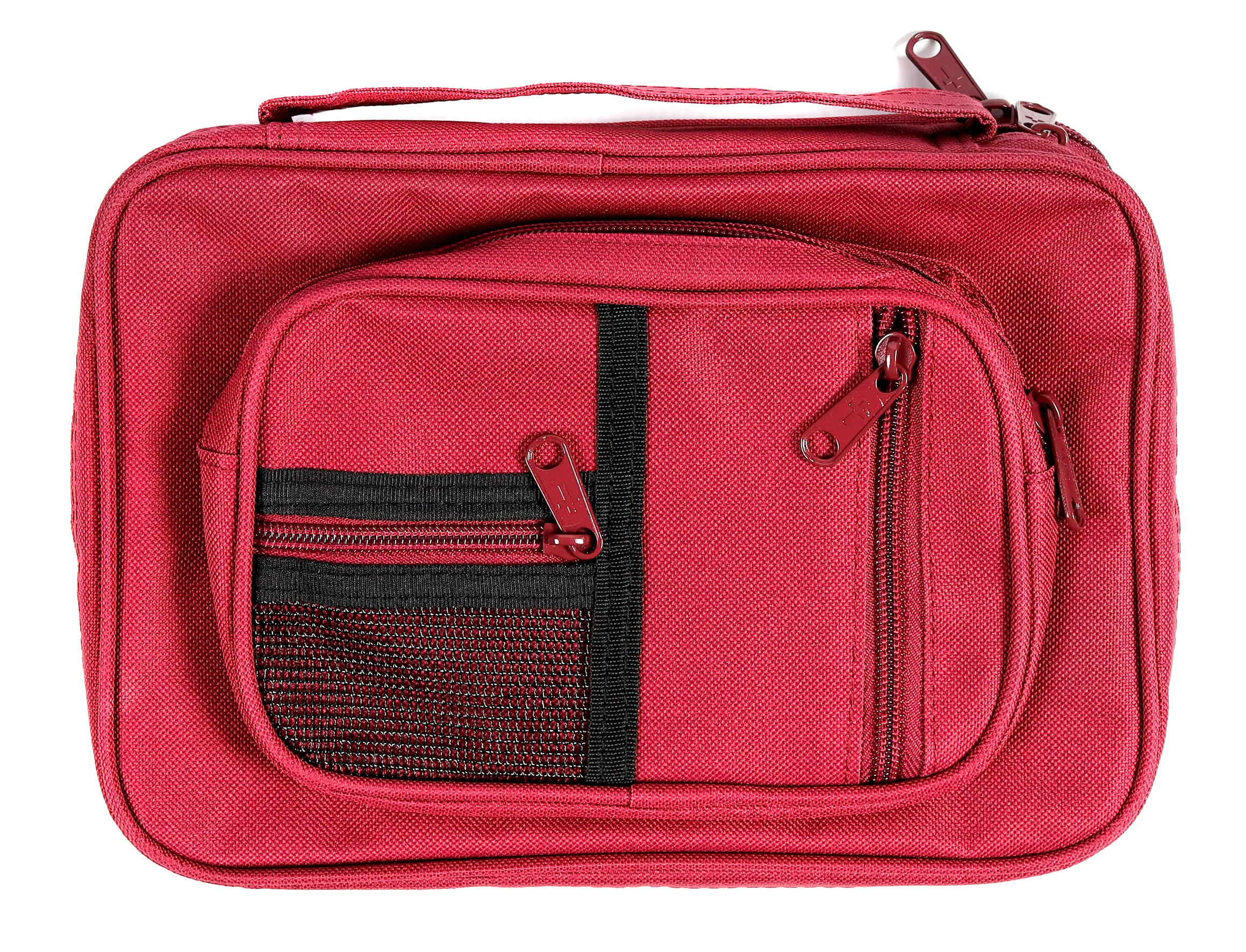 Durable, lined case with sturdy spine handle features two separate compartments, each with wrap-around zipper closure.