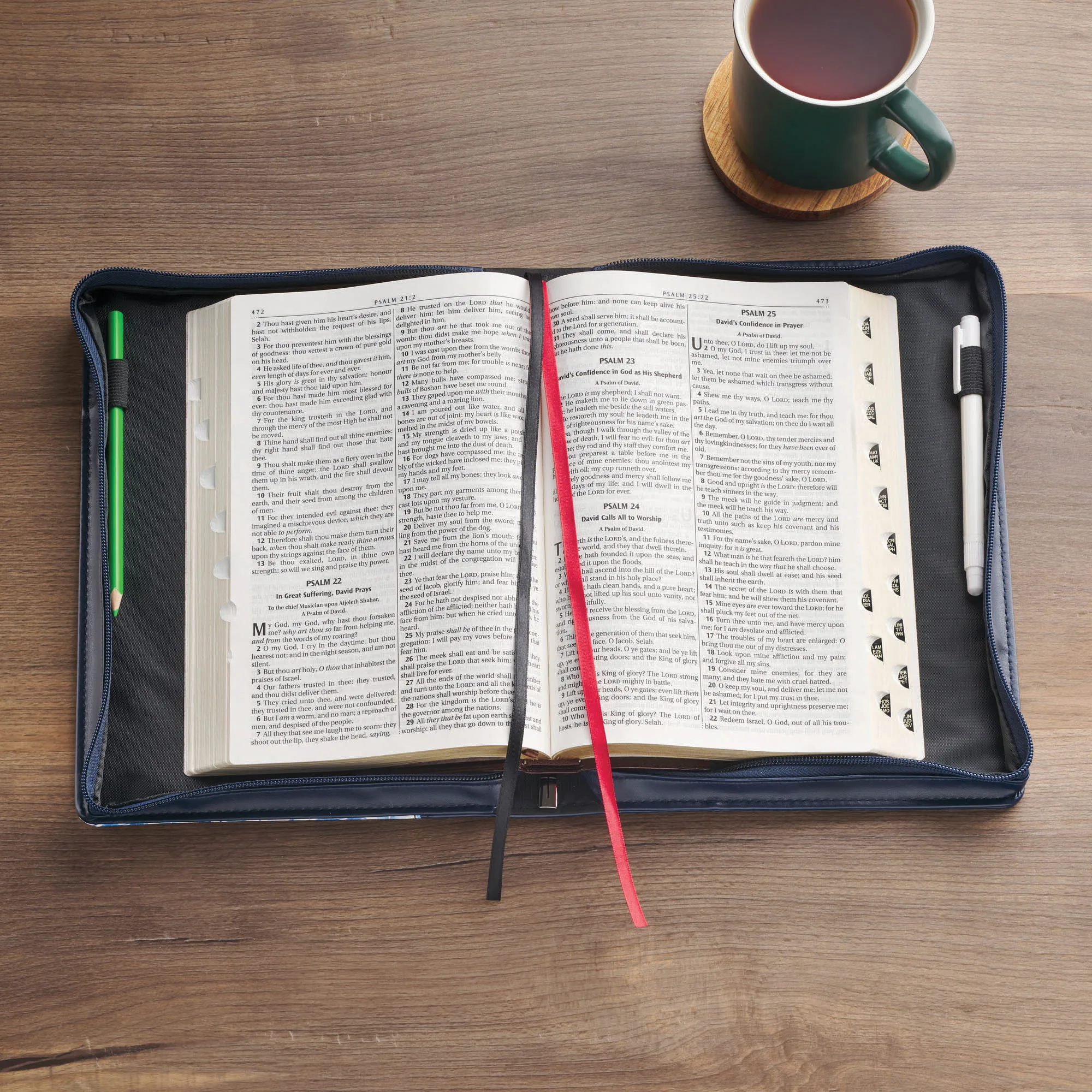 Let the gentle flutter of the flowers and leaves on the Trust in the Lord Blue Botany Faux Leather Bible Cover remind you to place your trust in the Lord. Just as the leaves do not resist the wind, your heart and mind should surrender to the prompting of the Holy Spirit. This lovely Bible cover will remind you to set your mind on the guidance of the Lord and grow in trusting and discerning His will.