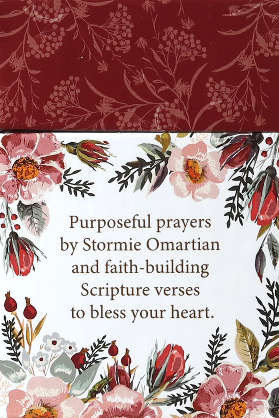 Your mind and heart will be filled with Scripture when you read the 50 double-sided cards. The front of each card features a prayer and is decorated with two flower patterns in opposing corners. The back of each card features a supporting Scripture verse, printed in a light pink box framed by a pink and red floral border.