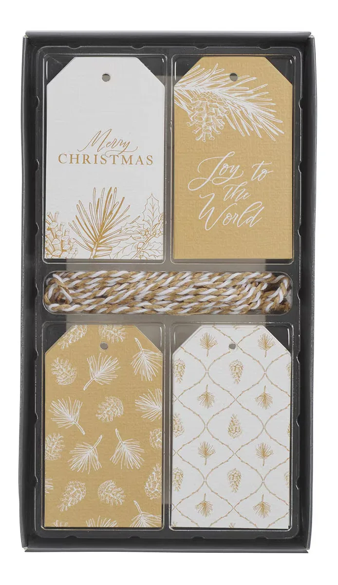 The Merry Christmas Golden Pine Gift Tag Set is part of the Peace on Earth Shimmer Collection. This is an extensive collection that includes a scented candle in a ceramic mug, a ceramic Christmas ornament, a boxed card set, a gift tag set, a ceramic plate, two paper napkin sets, a scented candle in a glass jar, a resin stocking holder, a gift tin, a gift bag, a reusable shopping tote bag, and a wrapping paper set.
