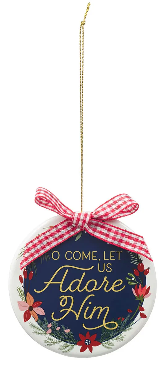 Reflect on the true spirit of the season when you add the Adore Him Blue Ceramic Disc Ornament to your Christmas decoration collection.