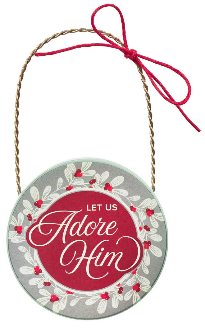 Dusty teal and red disc ornament Add the Adore Him Round Resin Christmas Ornament to a wreath on your front door to announce the reason for the season to all who enter.