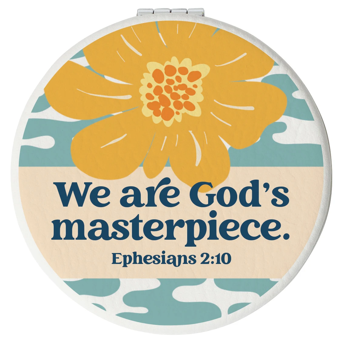 Compact Mirror: We Are God's Masterpiece, Blue/Yellow Flower, Leatherette