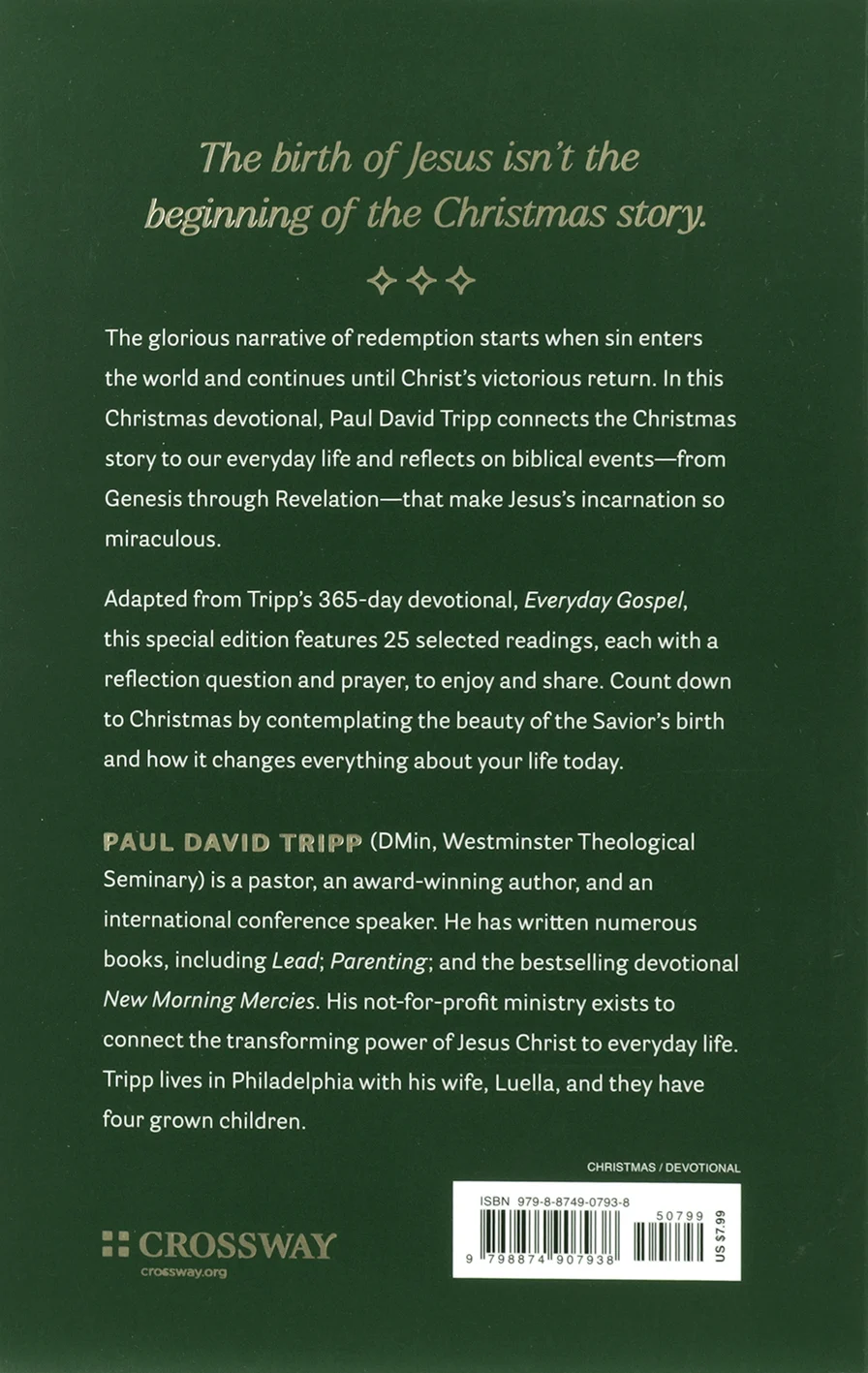 <p><strong>Celebrate Christmas with 25 Devotions from Paul David Tripp That Connect Scripture to Everyday Life</strong></p> <p>Jesus’s birth isn’t the beginning of the Christmas story. The glorious narrative of redemption starts when sin enters the world and continues until Christ’s victorious return. In this special devotional, Paul David Tripp helps you celebrate your salvation by reflecting on biblical events—from Genesis through Revelation—that make Jesus’s incarnation so miraculous.<br> <br>Adapted from Tripp’s 365-day devotional <em>Everyday Gospel</em>, this condensed edition features 25 selected readings, each with study questions, making it ideal for personal study or family devotions. Count down to Christmas Day with Tripp’s heartfelt reflections and contemplate the beauty and significance of the Savior’s birth.</p> <ul> <li> <strong>Great Christmas Activity:</strong> Devotional leads individuals, families, and churches on a guided journey through the full gospel narrative</li> <li> <strong>Adapted from the Everyday Gospel Devotional: </strong>Written by Paul David Tripp, these 25 condensed readings are taken from his full 365-day devotional</li> <li> <strong>Part of the Everyday Gospel Suite: </strong>Also includes the <em>Everyday Gospel</em> book and the ESV<em> Everyday Gospel Bible</em> </li> <li> <strong>Fosters Consistent Bible Study:</strong> Inspires readers to apply God’s word daily and experience renewal through the gospel</li> <li><strong>Features Study Questions for Each Daily Reading</strong></li> </ul>