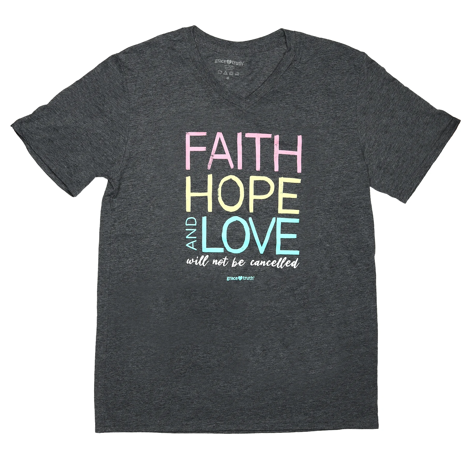 Faith Hope and Love Will Not Be Cancelled, Small, V-Neck, Dark Heather (Grace & Truth Womens T-shirts Series)