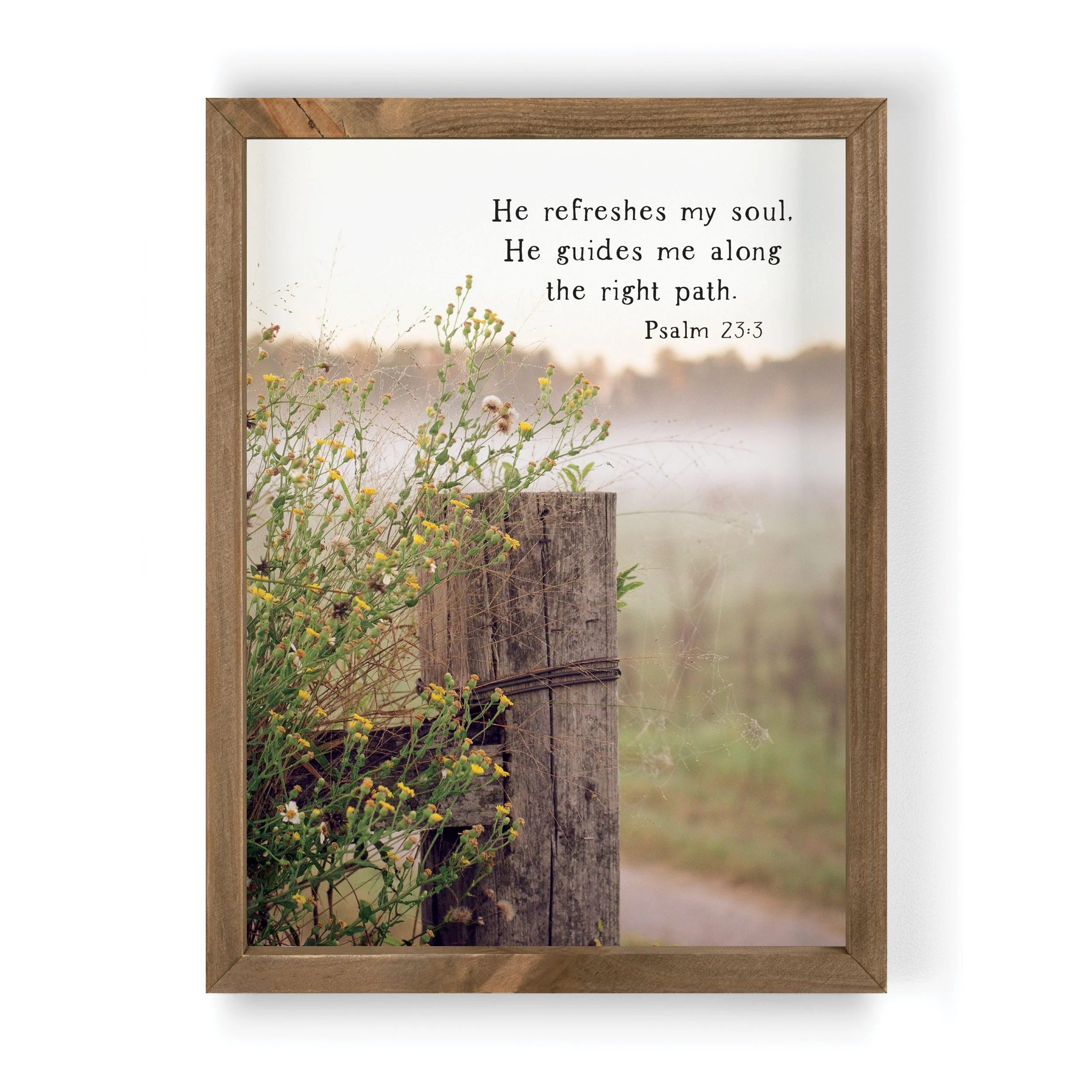Framed Wall Art, Mdf/Pine: He Refreshes My Soul. He Guides Me Along the Right Path, Psalm 23:3