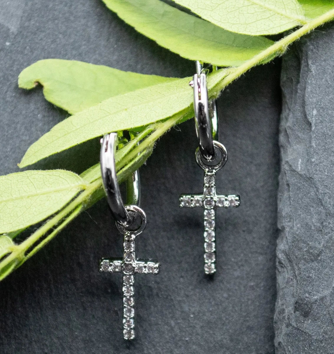 Glimmer Earrings, Sterling Silver Hoops: Silver Crosses, Cubic Zirconia Accents, Gift Boxed