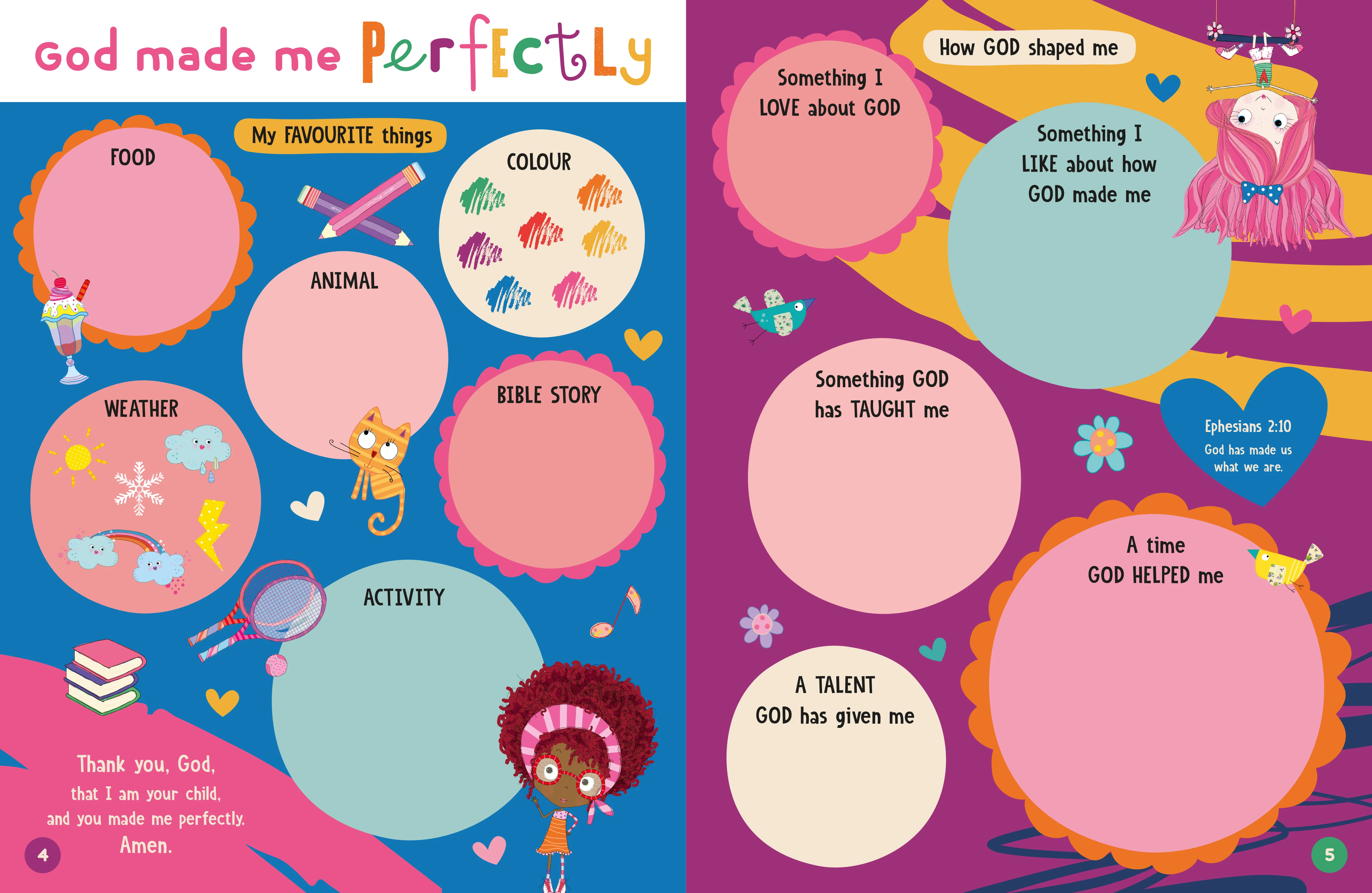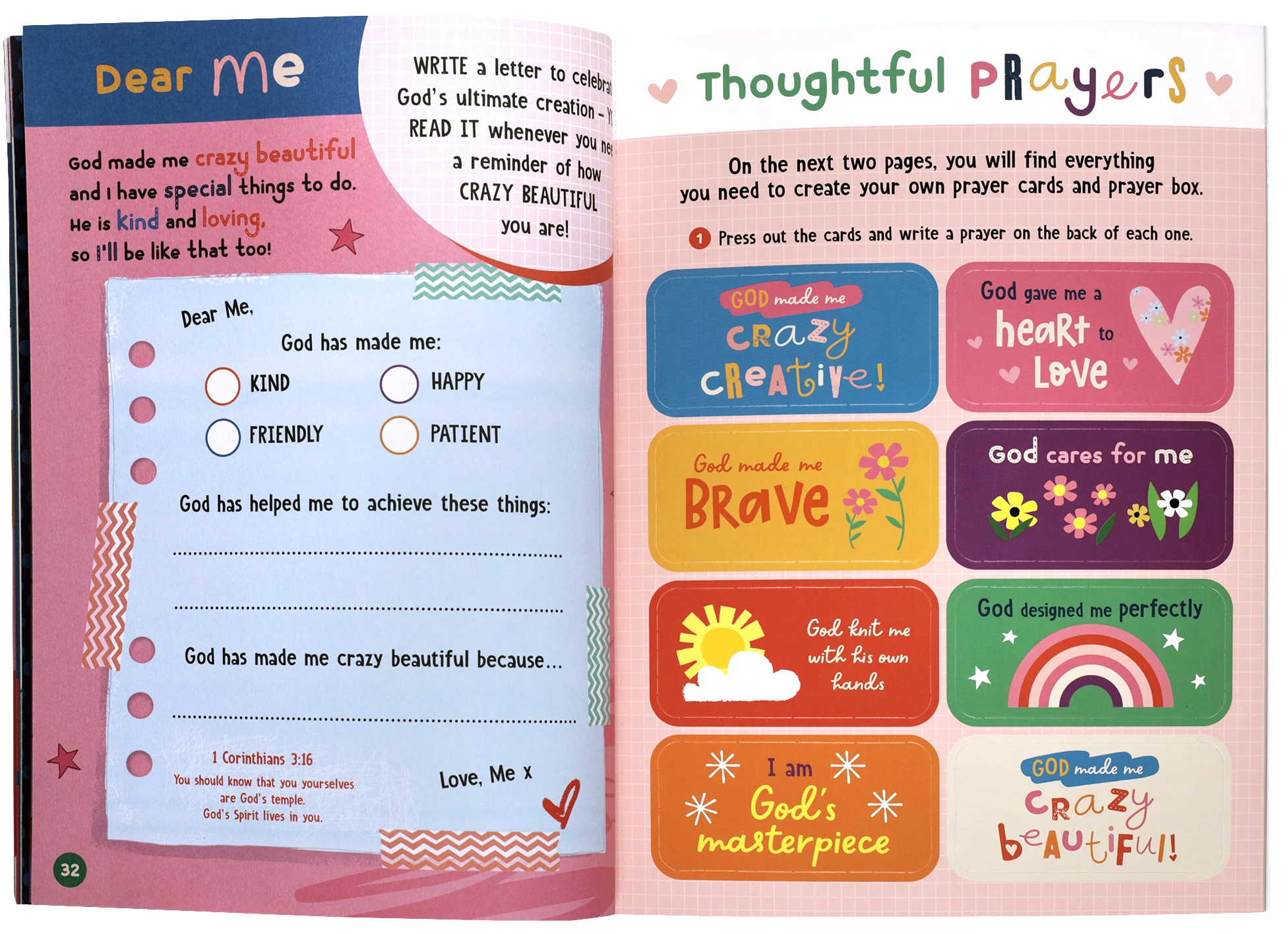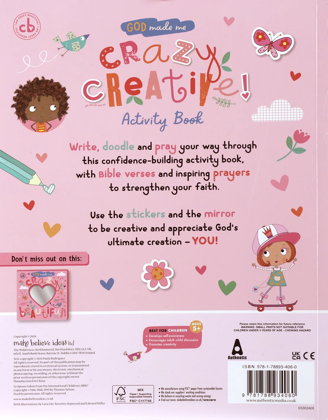 A gentle and uplifting book to encourage young girls God Made Me Crazy Creative! Activity Book enables children aged 5 and over to unleash their creative flair as they discover positive messages about self-esteem and their identity.