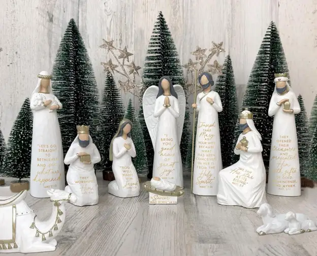 10 pieces in set (Mary, Baby Jesus, Joseph, angel, one shepherd, three wise men, camel, and lambs), handpainted, white finish, gold accents, Scripture in gold on character pieces.