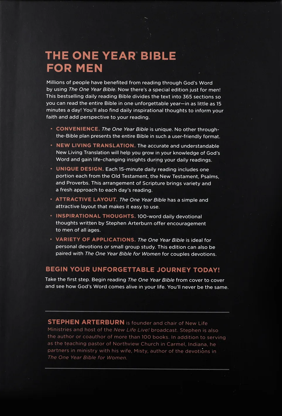 This 365-day NLT Bible in the bestselling One Year collection is designed specifically for men. This handsomely designed men's devotional Bible features the clear and trusted New Living Translation. Men can follow along each day through the designated Scripture readings and finish the entire Bible in one year in as little as 15 minutes a day.