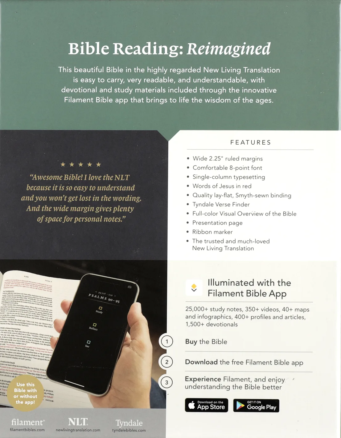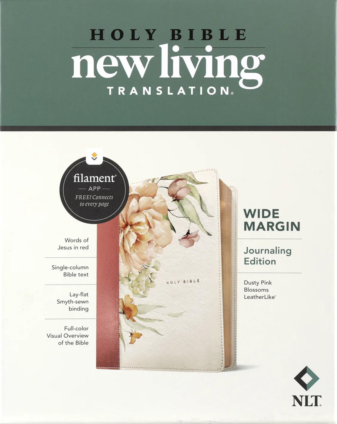 NLT Wide Margin Bible, Filament-Enabled Edition is the only journaling Bible with access to the Filament Bible app, which features thousands of study notes, devotionals, videos, reading plans, and more!