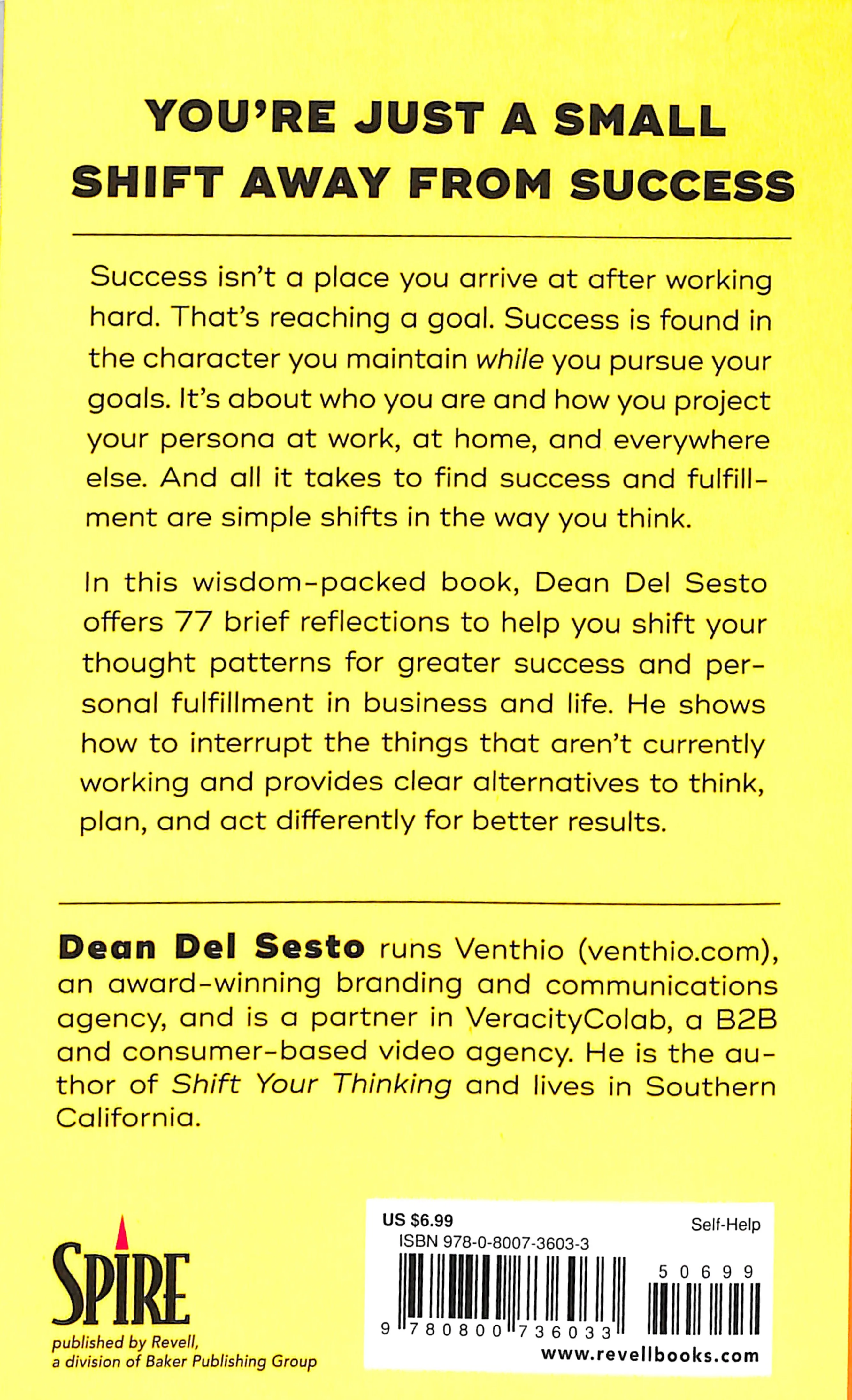 :Success isn't a place you arrive at after working hard. Success is found in the character you maintain while you pursue your goals. And all it takes to find success and fulfillment are simple shifts in the way we think. In this wisdom-packed book, Dean Del Sesto offers 77 brief reflections to help you shift your thought patterns for greater success in business and life. He shows how to interrupt the things that aren't currently working and provides clear alternatives to think, plan, and act differently for better results. Perfect for leaders, influencers, businesspeople, coaches, teachers, and professionals of all industries.