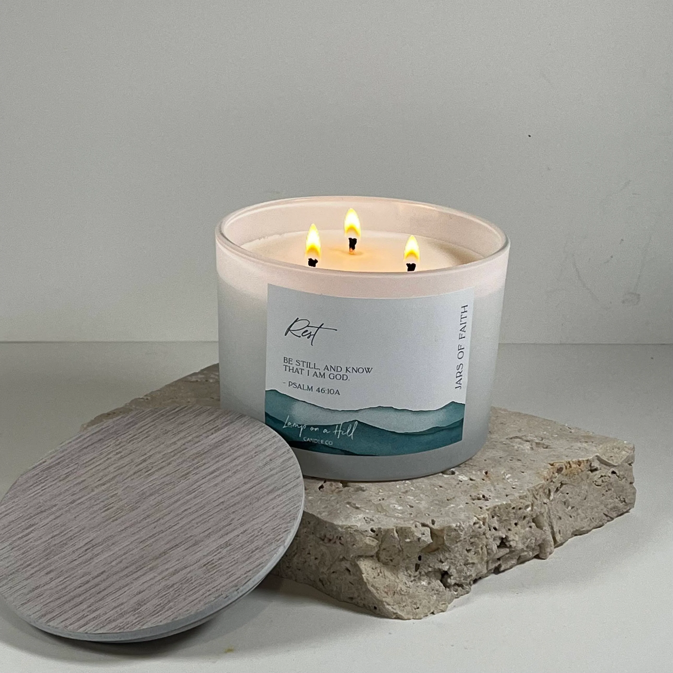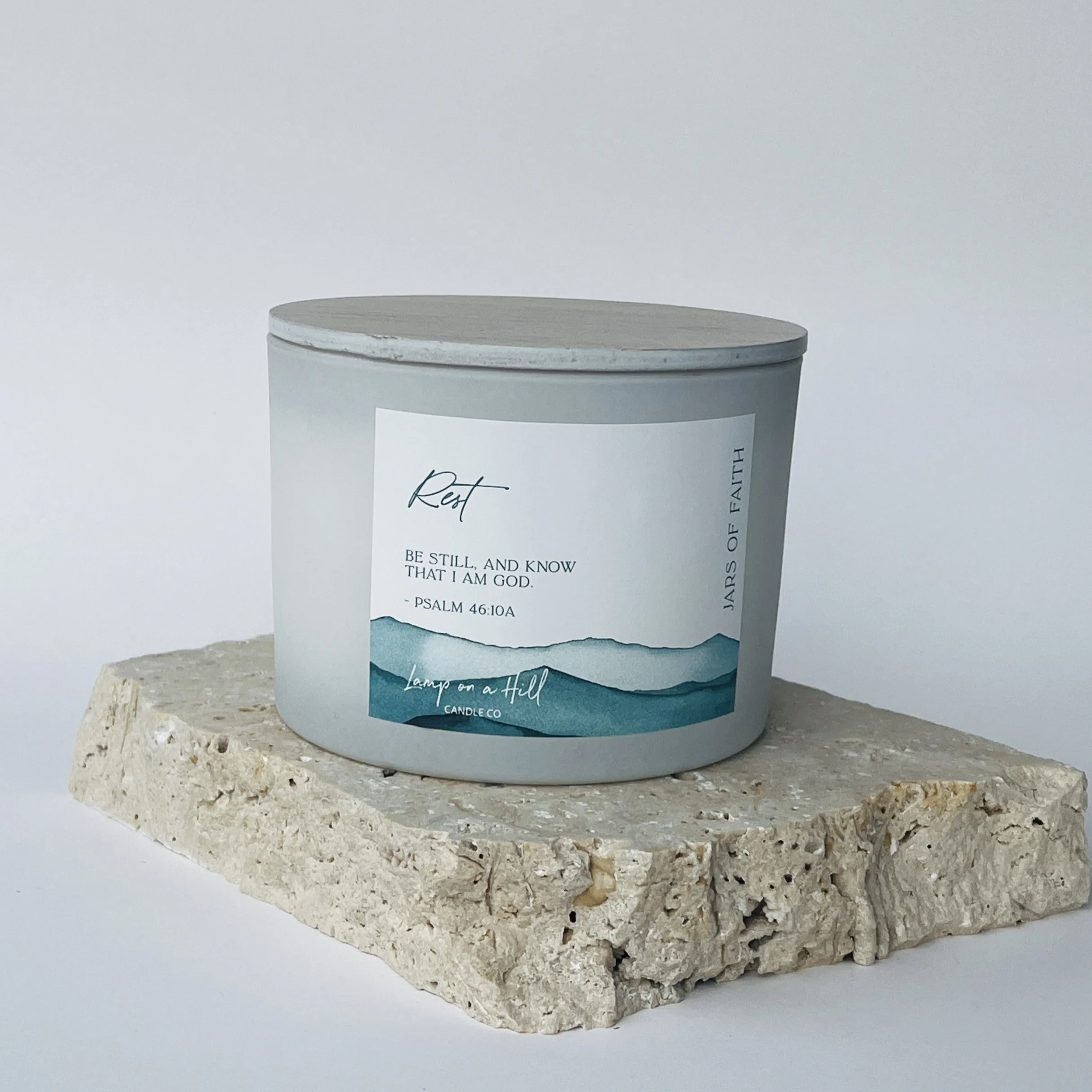 Soy Blend Candle (48 hours burn time, 330g): Jars of Faith, Rest, Psalm 46:10a, Teal, Fragrance English Pear & Freesia