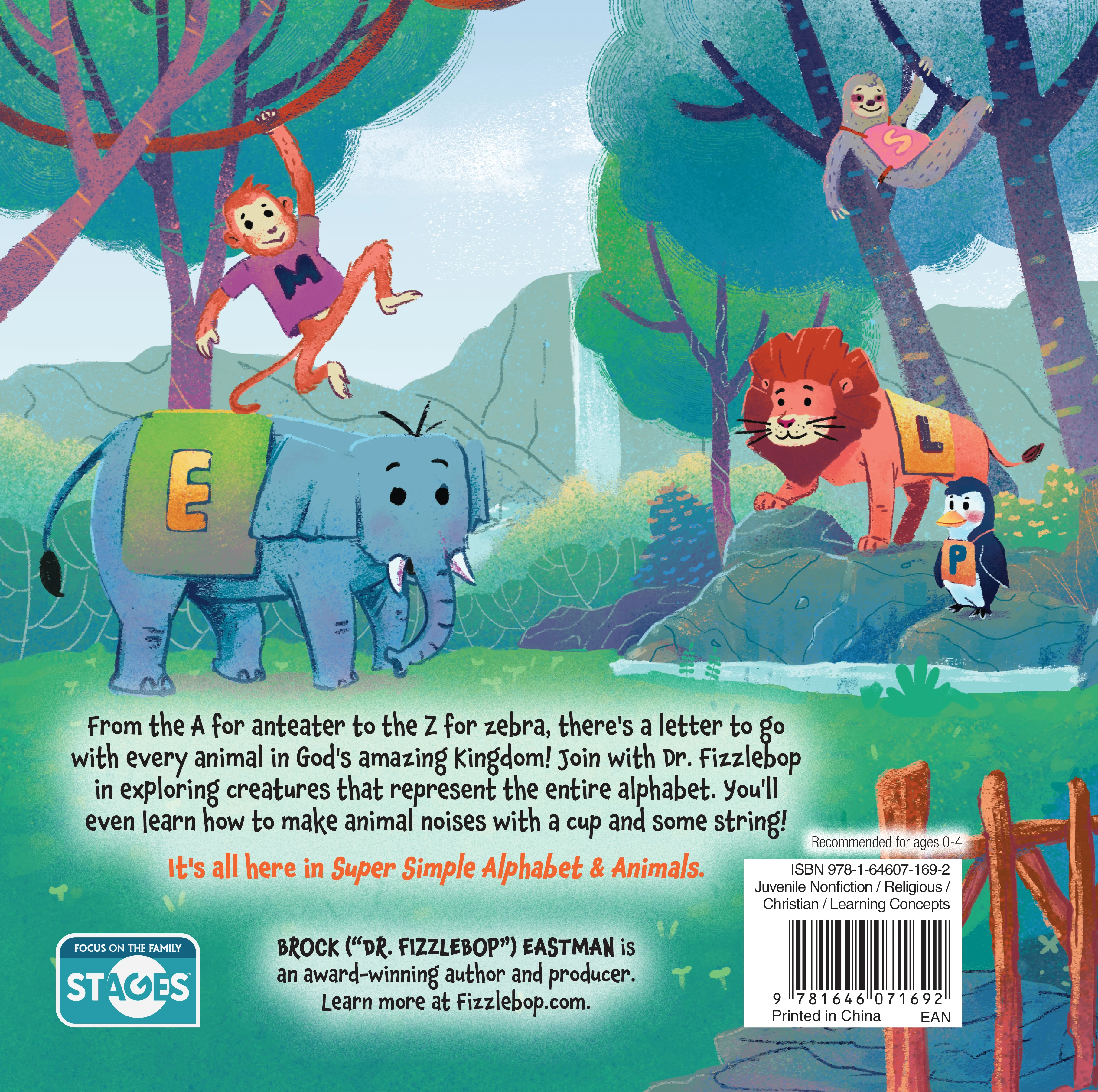 Bedtime read alouds and family devotions Homeschool lessons Christian school classrooms Church nursery story times Super Simple Alphabet and Animals with Dr. Fizzlebop combines learning all the letters of the alphabet with corresponding animal names. Each page includes fun zoology facts that help teach the ABCs, build vocabulary, and encourage curiosity. Bright, cheerful pictures capture kids' attention while simple, God-centered explanations help children see God's loving hand in every part of His creation.
