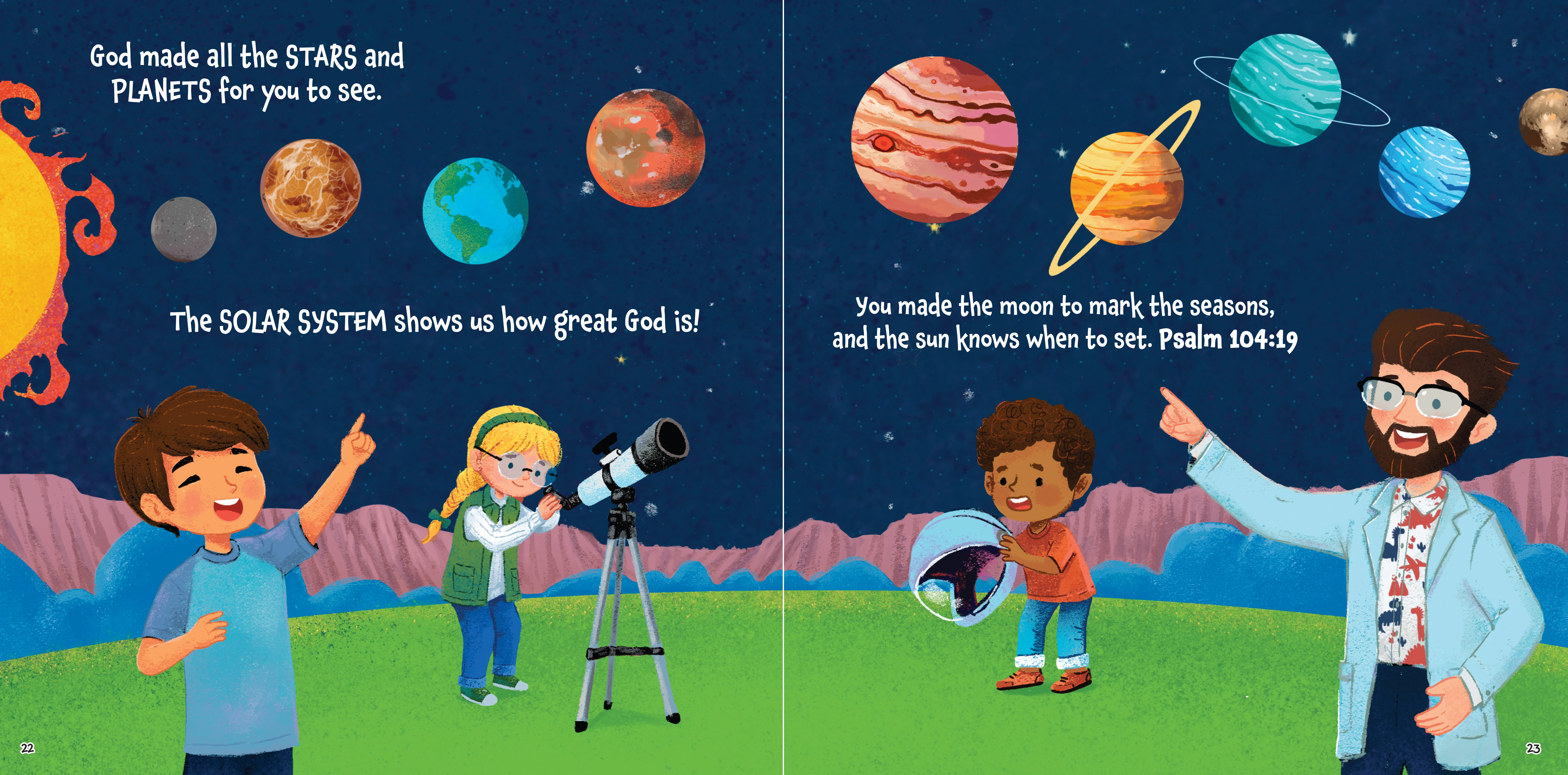 Bedtime read alouds and family devotions Homeschool lessons Christian school classrooms Church nursery story times Super Simple Space Science with Dr. Fizzlebop introduces little learners to the basics of outer space! They will learn about the sun, moon, stars, and the planets in our solar system. Each astronomy concept is explained in an engaging way that builds vocabulary and encourages curiosity. Bright, cheerful pictures capture kids' attention while simple, God-centered explanations help children see God's loving hand in every part of His creation.