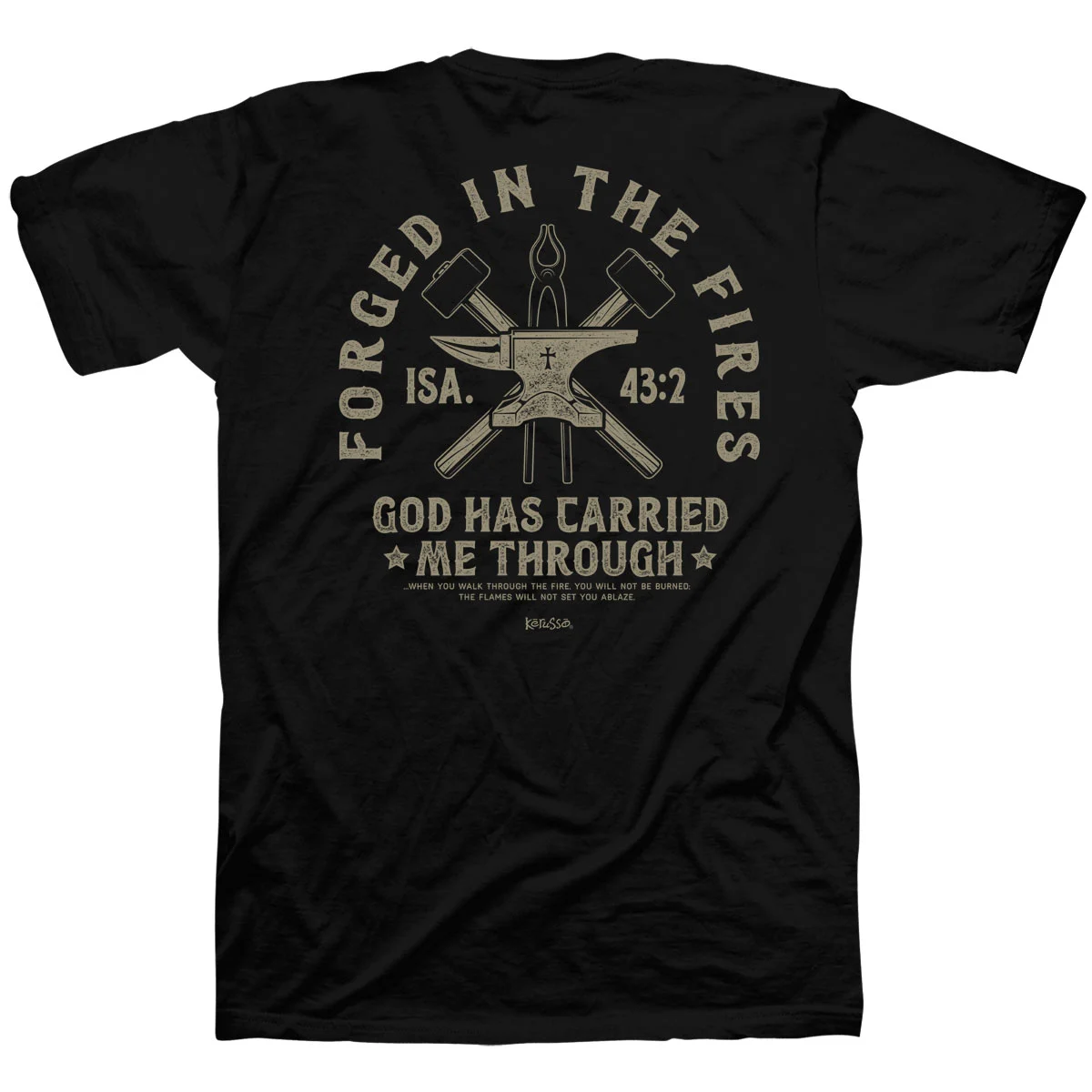 Forged In Fires⢠Proclaim the steadfast strength of your faith in this āForged In Firesā KerussoĀ® T-Shirt in Black. Whatever trials we face in this life, when we believe in Jesus, we know God will carry us through. Faith is more than a sloganāit is an impactful, powerful way to live our lives. This bold T-shirt is an awesome way to share your faith, and introduce someone to the Good News about Jesus Christ. Everyone faces trials of one kind or another in this life, and you could be the person who introduces someone else to the saving grace found in a personal relationship with the Lord.