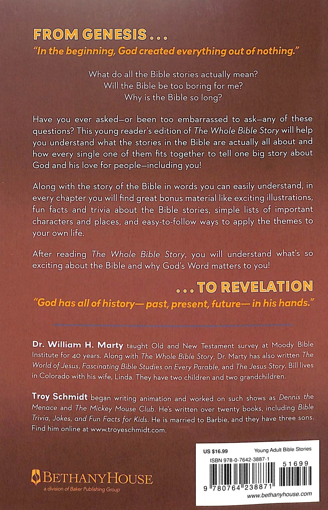 In this young reader's edition of an ongoing seller, Dr. William Marty's retelling of the entire narrative of the Bible is an easy-to-read, chronological account formatted and revised to appeal to a younger audience. Engaging illustrations throughout will enhance young readers' experience as the plot and characters of Scripture come to life in new and exciting ways.