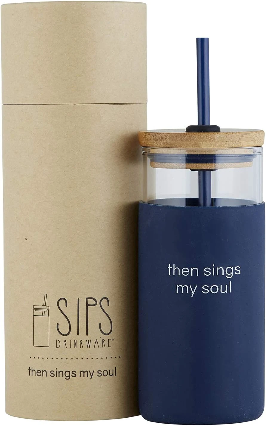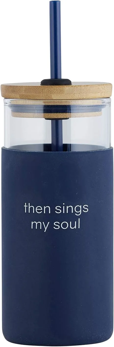 Tumbler, Glass With Bamboo Lid and Straw, 532ml: Then Sings My Soul, Navy, Comes in a Kraft Tube
