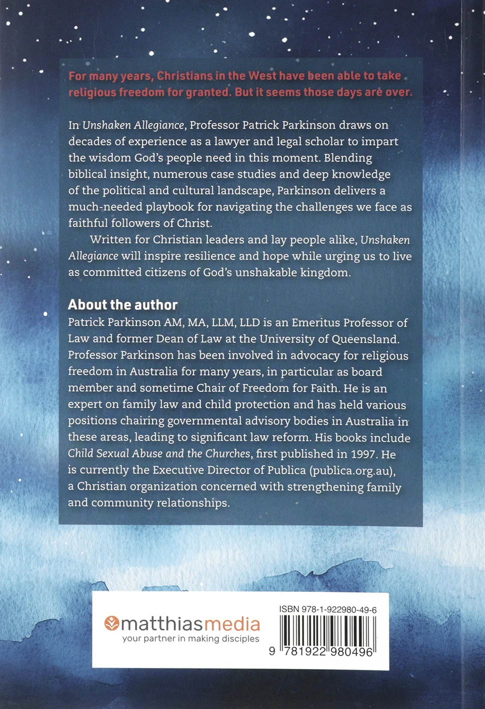 Renowned international lawyer Patrick Parkinson has spent decades practicing law, analyzing the shifting landscape of the West, and arguing the legal case for religious freedom. In Unshaken Allegiance, Parkinson combines a sharp theological mind with his vast understanding of the law, offering a guide that will help every Christian navigate the legal and spiritual minefield that lies before us. Filled with case studies and biblical insights, driven by a passion for both the law and the gospel, this is an indispensable resource for every Christian.