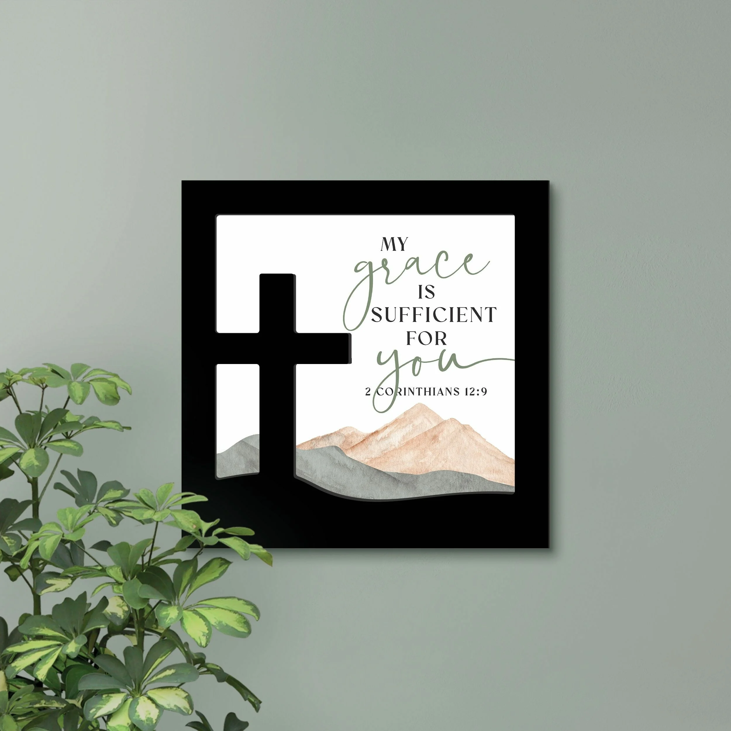 Wall Art, Mdf: My Grace is Sufficient For You, 2 Cor. 12:9, Cross and Mountains, Milled Hanger Hole