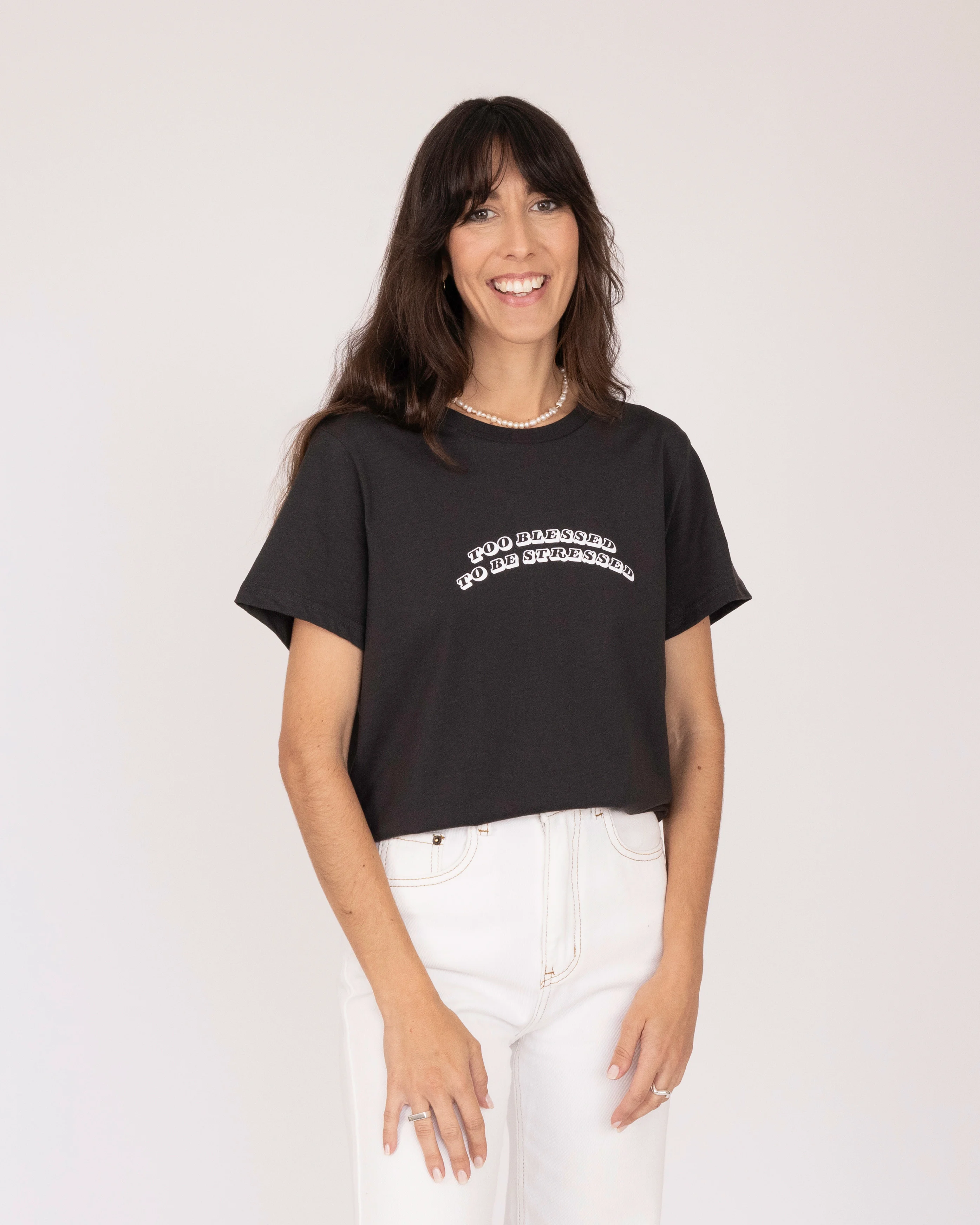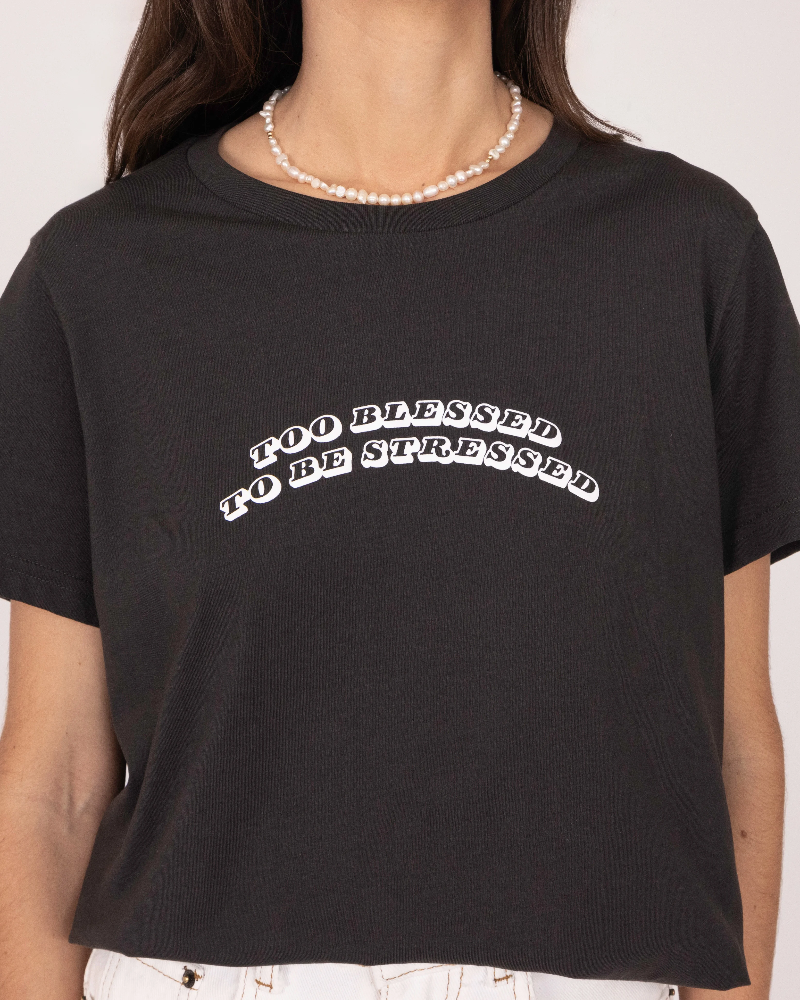 Womens Maple Tee: Too Blessed To Be Stressed, XSmall, White on Coal